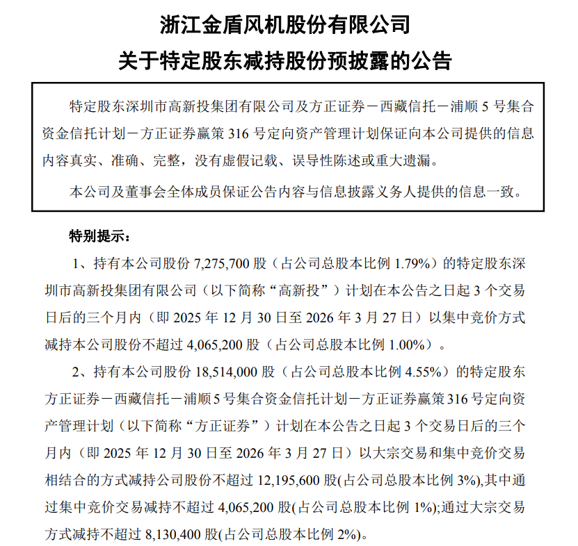 12月24日,金盾股份(300411.SZ)发布公告,特定股东深圳市高新投集团有限公司(以下简称“高新投”)计划在本公告之日起3个交易日后的三个月内(即2025年12月30日至2026年3月27日)以集中竞价方式减持公司股份不超过406.52万股(占公司总股本比例1.00%)。