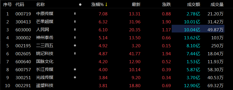 今日(6月5日),数字媒体板块领涨,凡拓数创涨超10%,芒果超媒、人民网涨超6%,风语筑、新华网等跟涨。