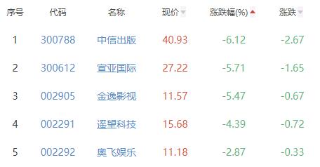 中信出版、宣亚国际、金逸影视、遥望科技、奥飞娱乐位列涨幅榜后五位,涨幅分别为-6.12%、-5.71%、-5.47%、-4.39%、-2.87%。