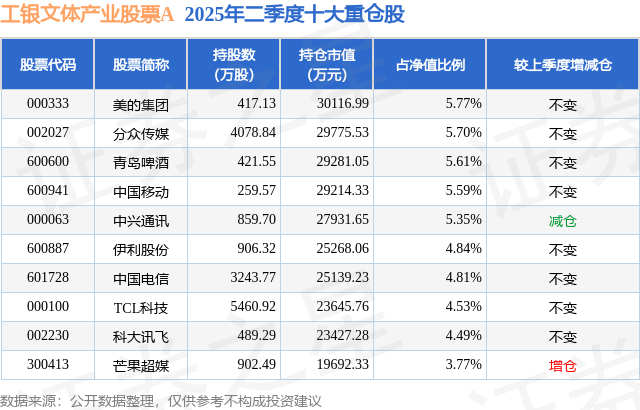 工银文体产业股票A的前十大重仓股如下: