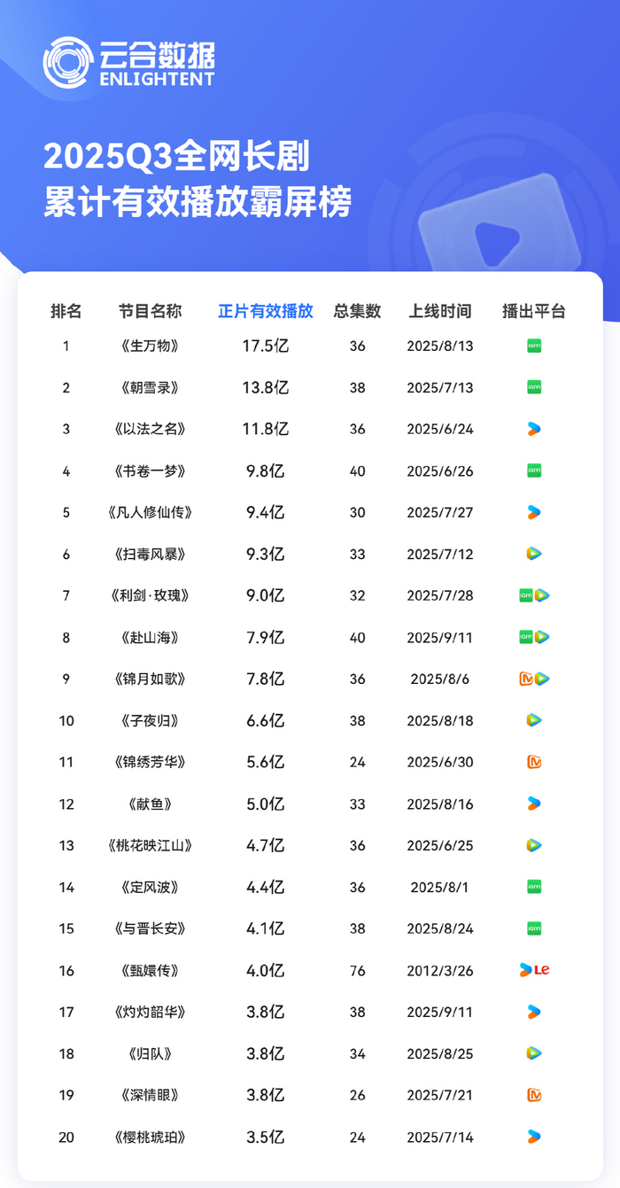 然而,虽然综艺成绩亮眼,但芒果TV在剧集上存在长期短板。在云合数据发布的2025 Q3全网长剧累计有效播放霸屏榜上,芒果TV仅有两部独播剧——《锦绣芳华》和《深情眼》上榜,分别位列第11名和第19名。