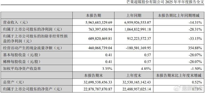 2025年中报显示,今年上半年芒果超媒的营收、归母净利润依旧没能扭转2024年“双下滑”颓势。上半年,公司营业总收入为59.64亿元,较去年同期减少9.96亿元,同比下降14.31%。归母净利润为7.63亿元,较去年同期减少3.01亿元,同比下降28.31%。