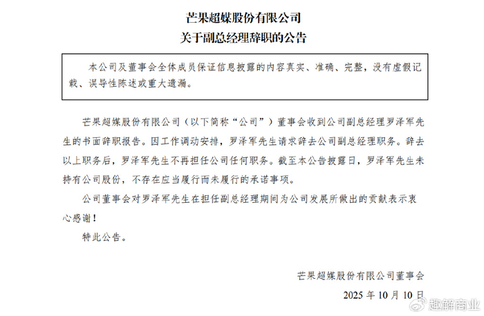 10月10日,芒果超媒公告,公司董事会收到副总经理罗泽军的书面辞职报告。因工作调动安排,罗泽军请求辞去副总经理职务。辞任后,罗泽军不再担任公司任何职务,目前未持有公司股份。公司董事会对其在任期间的贡献表示感谢。