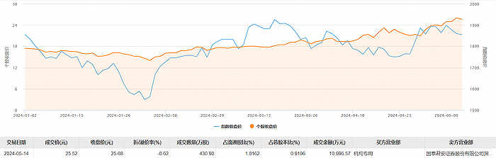 5月14日大宗交易成交430.9万股,成交额1.1亿元,占当日总成交额的37.22%,成交价25.52元,较市场收盘价25.68元折价0.62%。
