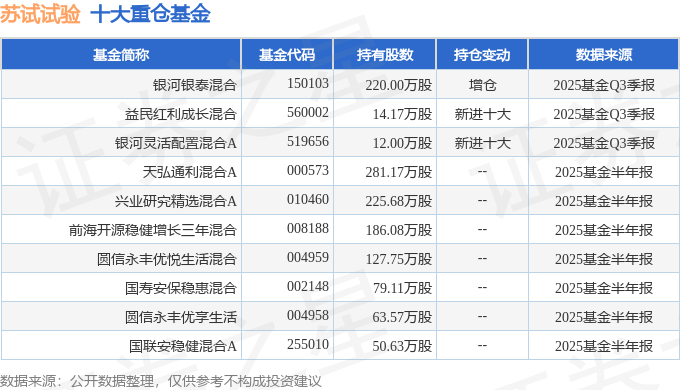 持有苏试试验最多的基金为银河银泰混合,目前规模为10.25亿元,最新净值0.757(10月27日),较上一交易日上涨0.65%,近一年上涨13.51%。该基金现任基金经理为石磊。