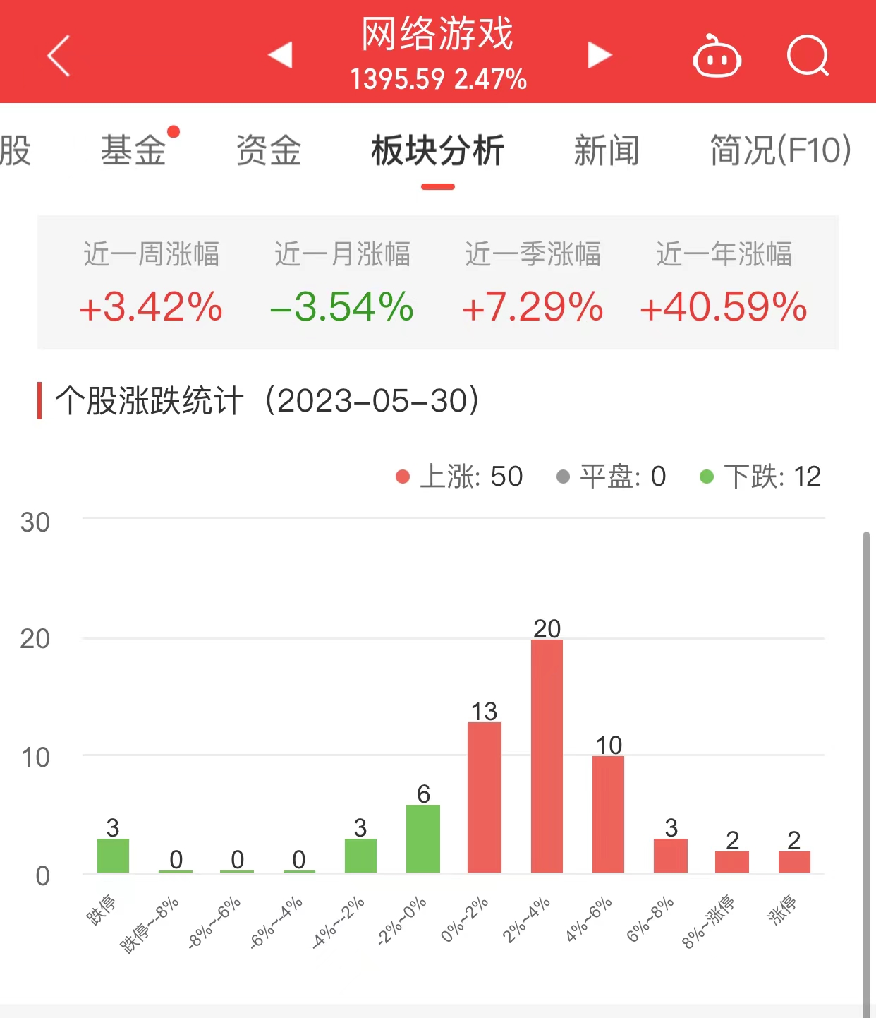 中国经济网北京5月30日讯今日,网络游戏板块整体涨幅2.47%,其中50只股票上涨,0只股票平盘,12只股票下跌。