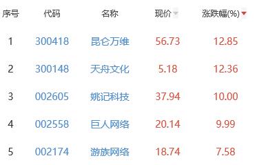 其中,昆仑万维、天舟文化、姚记科技、巨人网络、游族网络位列板块涨幅前五位,涨幅分别为12.85%、12.36%、10.00%、9.99%、7.58%。