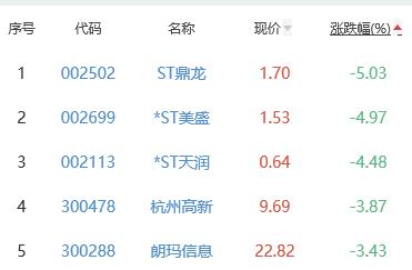 ST鼎龙、*ST美盛、*ST天润、杭州高新、朗玛信息位列涨幅榜后五位,涨幅分别为-5.03%、-4.97%、-4.48%、-3.87%、-3.43%。