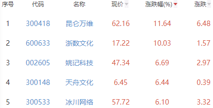 其中,昆仑万维、浙数文化、姚记科技、天舟文化和冰川网络位列板块涨幅前五位,涨幅分别为11.64%、10.03%、6.69%、6.44%和6.10%。