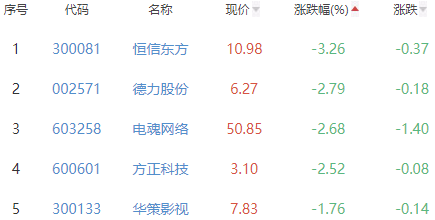恒信东方、德力股份、电魂网络、方正科技和华策影视位列涨幅榜后五位,涨幅分别为-3.26%、-2.79%、-2.68%、-2.52%和-1.76%。