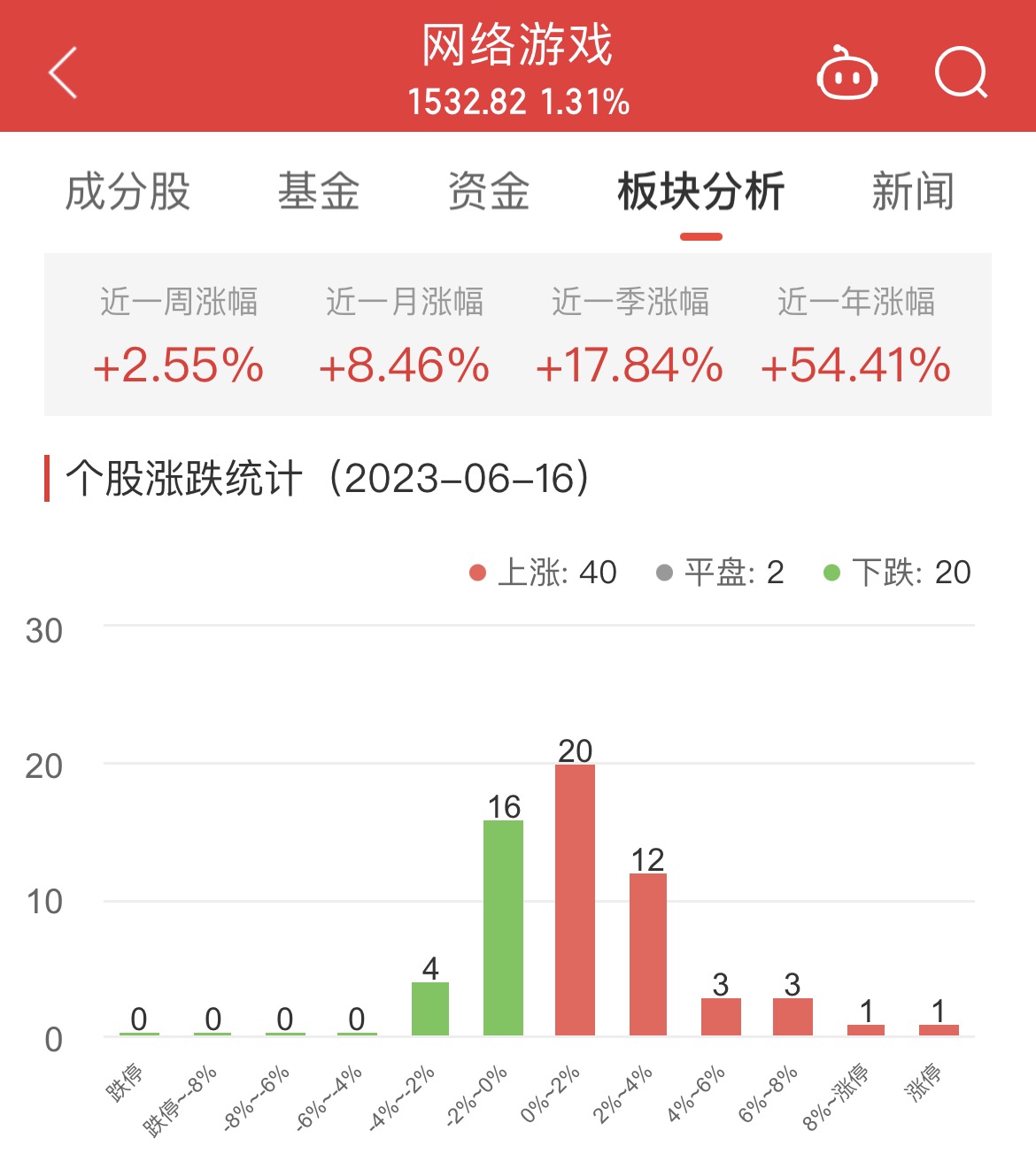 中国经济网北京6月16日讯今日,网络游戏板块整体涨幅1.31%,其中40只股票上涨,2只股票平盘,20只股票下跌。