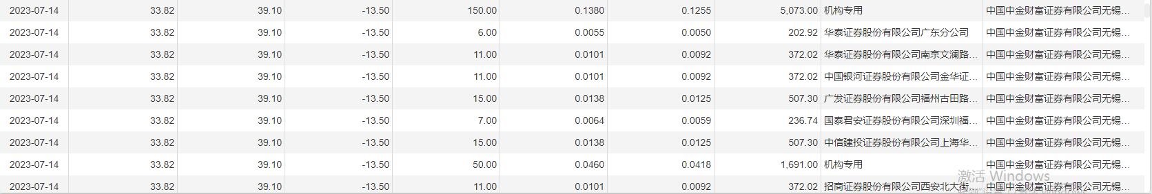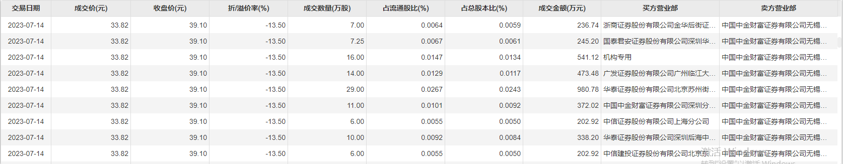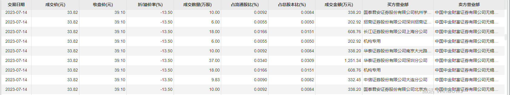 出现多笔折价大宗交易共计2.96亿元,成交价均为33.82元,卖方均为财富证券无锡分公司营业部,部分买方为机构席位。