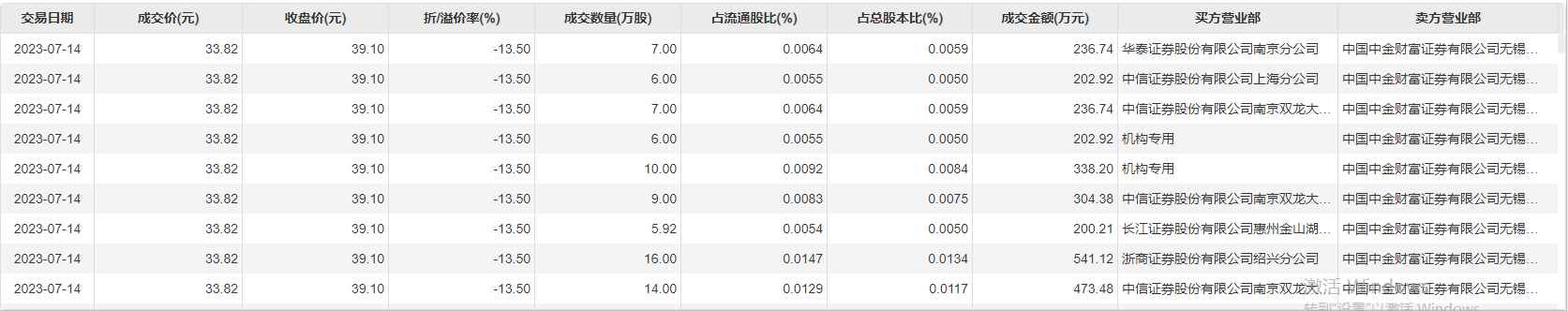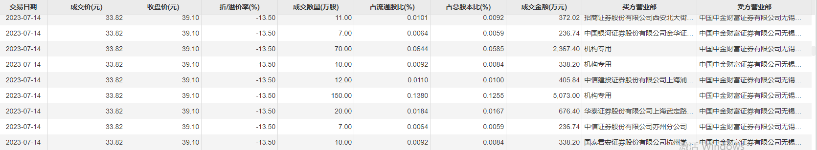 7月14日大宗交易成交875万股,成交额2.96亿元,占当日总成交额的7.05%,成交价33.82元,较市场收盘价39.1元折价13.5%。