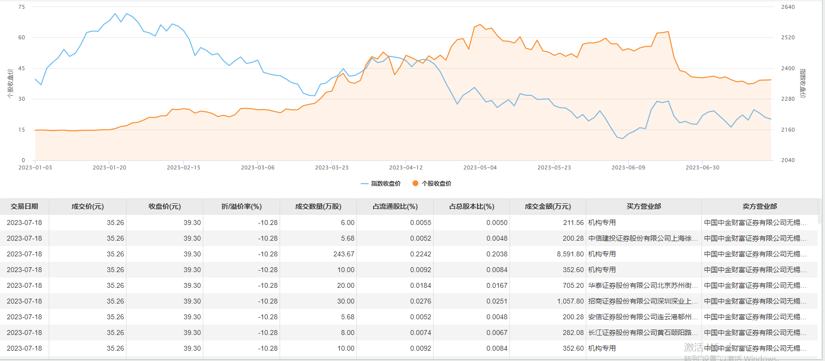 7月18日大宗交易成交349.03万股,成交额1.23亿元,占当日总成交额的3.72%,成交价35.26元,较市场收盘价折价10.28%。