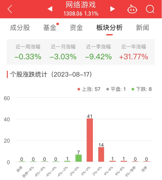 中国经济网北京8月17日讯今日,网络游戏板块整体涨幅1.31%,其中57只股票上涨,1只股票平盘,8只股票下跌。