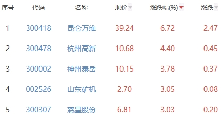其中,昆仑万维、杭州高新、神州泰岳、山东矿机、慈星股份位列板块涨幅前五位,涨幅分别为6.72%、4.40%、3.78%、3.05%、3.03%。