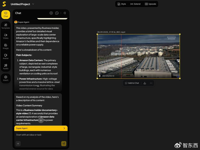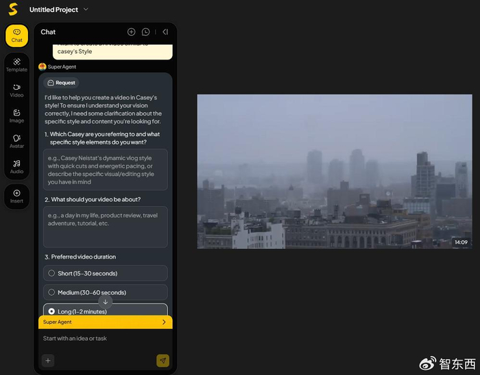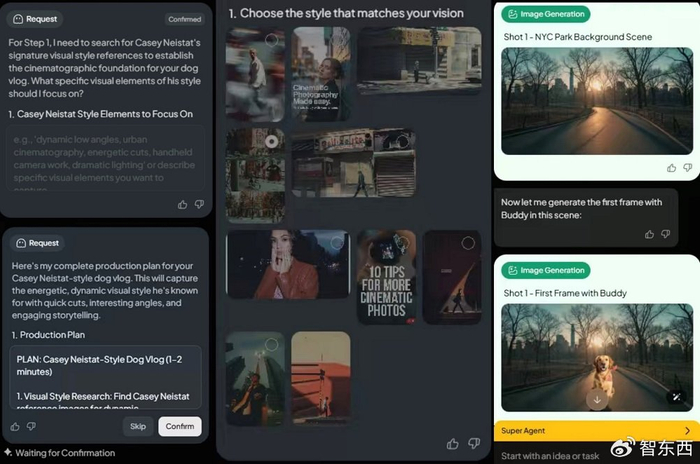 我们可以上传Neistat的Vlog,并输入指令“按照Casey Neistat的风格帮我打造一只关于小狗的Vlog”。Super Agent系统能根据视频的内容,并结合公开信息,分析提炼创作风格。