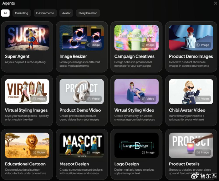 熟悉AI工具的用户可以直接使用AI模型生成图片、视频、音频或数字人内容;希望更高效创作的用户,则可依托近30款聚焦特定场景的Expert Agent,快速完成生成;而对没有创作经验的小白用户,只需套用智能模板,通过简单的文字描述和画面替换,即可轻松复刻参考内容。