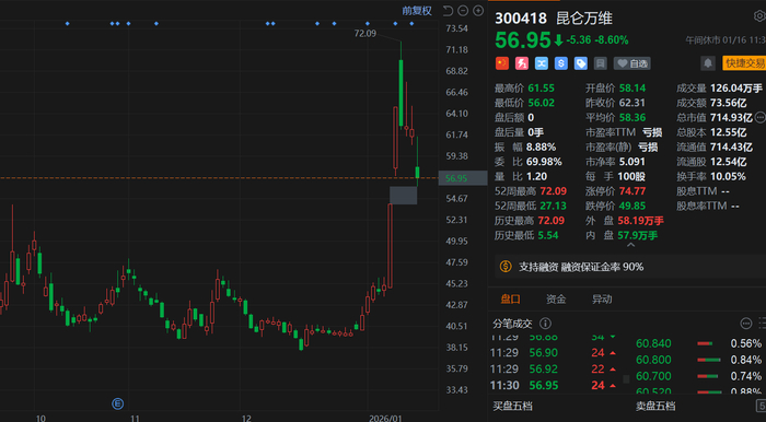 昆仑万维(300418.SZ)午间收跌8.6%报56.95元,总市值715亿元。消息上,昆仑万维昨日盘后公告,公司财务部门初步测算,预计2025年年度归属于上市公司股东的净利润为负值,公司2025年年度经营业绩将出现亏损。此外,近日,AI应用板块监管信号强化,多家公司因股价异动停牌核查,市场情绪迅速降温。昆仑万维作为板块内活跃个股,受此影响资金出逃迹象明显。