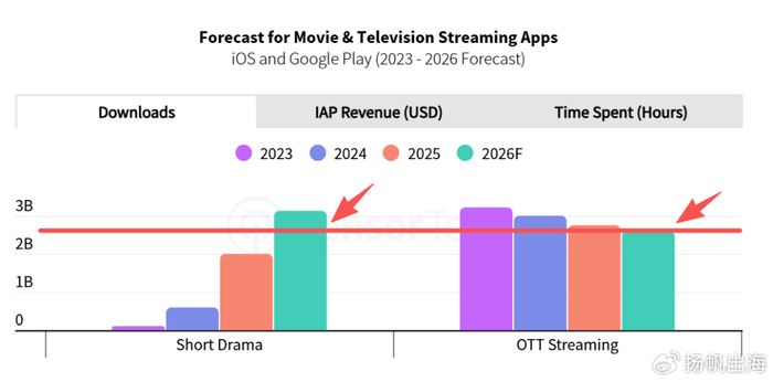 2026年,短剧应用的下载量或将有望超过Netflix为代表的流媒体平台 图源:Sensor Tower《Predictions for the DigitalEconomy in 2026》