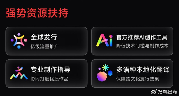 入围及获奖者不仅能参与百万美金激励,更将获得覆盖创作全链路的资源扶持,包括:全球亿级流量发行推广、官方AI创作工具支持、专业制片指导、多语种本地化翻译服务等。