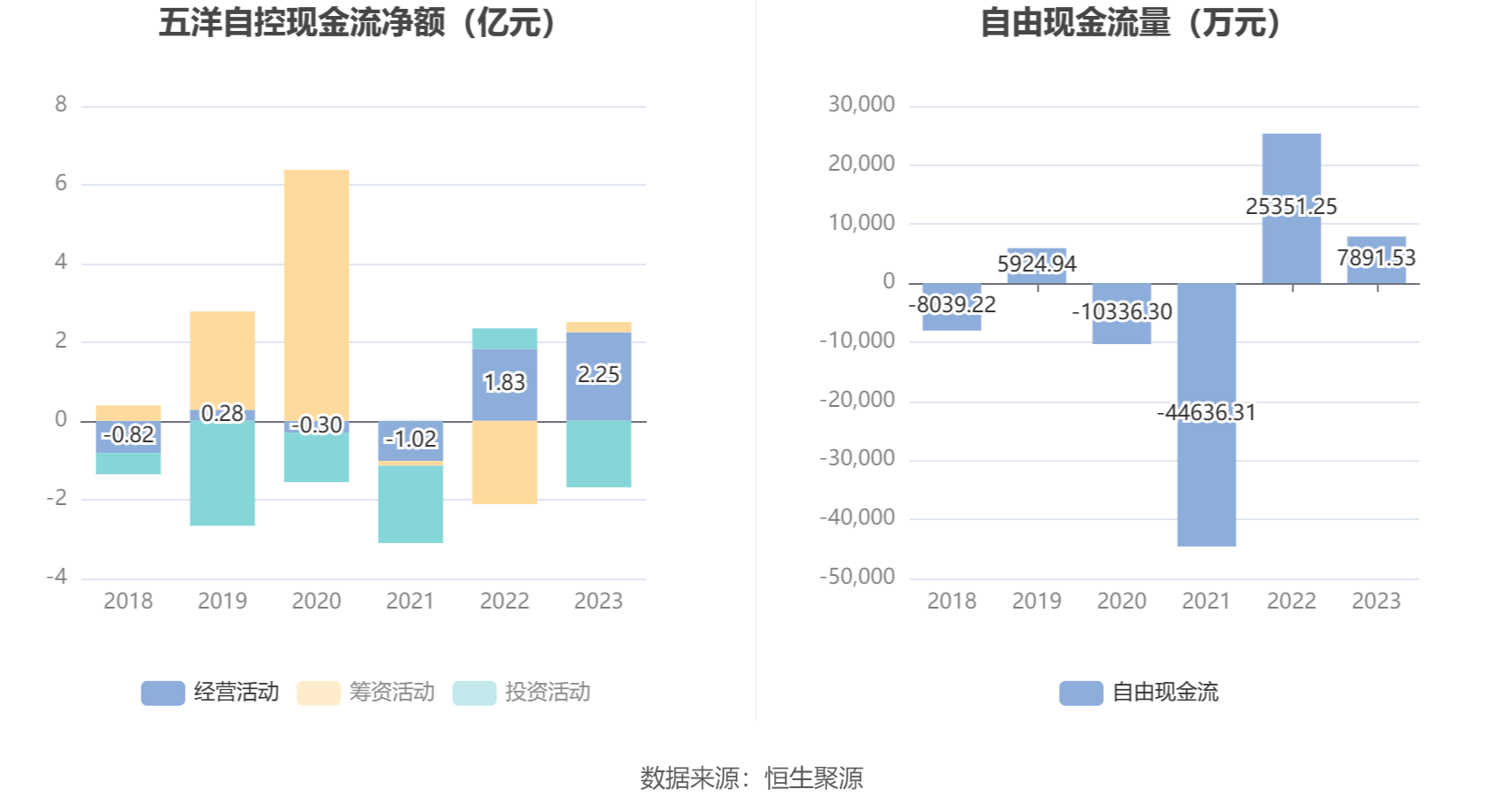 2023年,公司经营活动现金流净额为2.25亿元,同比增长23.04%;筹资活动现金流净额2571.69万元,同比增加2.37亿元;投资活动现金流净额-1.69亿元,上年同期为5194.73万元。