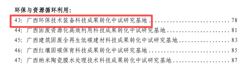 基地于2021年11月成功入选自治区第一批科技成果转化中试研究基地名单,其服务领域于2025 年11月被收录至《广西科技成果转化中试研究基地开放服务手册(2025 年版)》环保与资源循环利用领域范围内。