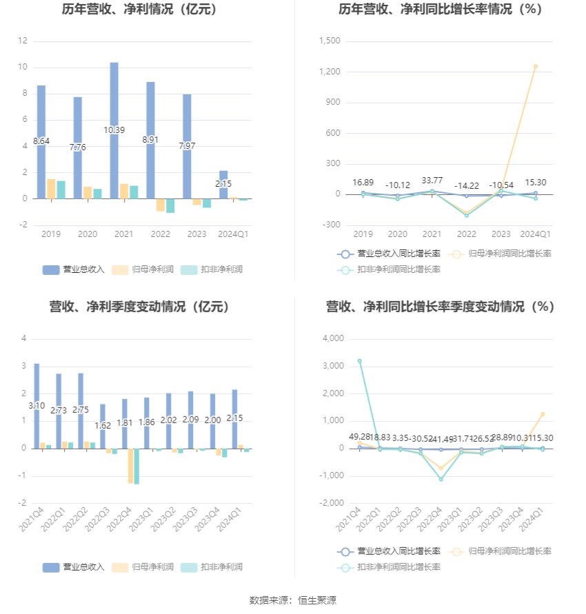 2024年第一季度,公司毛利率为24.03%,同比下降1.85个百分点;净利率为6.15%,较上年同期上升7.36个百分点。