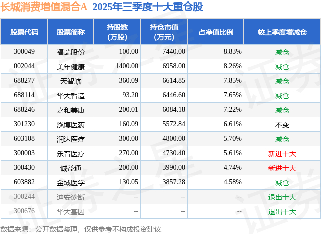 长城消费增值混合A的前十大重仓股如下: