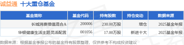 根据2025基金年报公募基金重仓股数据,重仓该股的公募基金共2家,其中持有数量最多的公募基金为长城基金的长城消费增值混合A。长城消费增值混合A目前规模为5.16亿元,最新净值1.3465(1月15日),较上一交易日下跌3.07%,近一年上涨44.1%。该公募基金现任基金经理为龙宇飞。