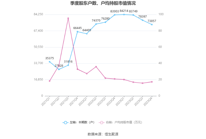 筹码集中度方面,截至2023年年末,公司股东总户数为7.39万户,较三季度末下降了4540户,降幅5.79%;户均持股市值由三季度末的15.79万元上升至17.39万元,增幅为10.13%。