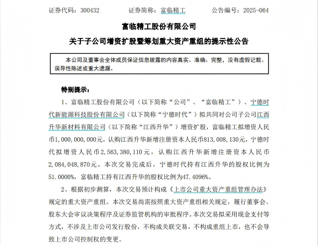 昨日晚间,富临精工宣布一则喜讯——公司联手锂电巨头宁德时代对子公司江西升华进行增资扩股。其中,富临精工和宁德时代分别拟增资10亿元和25.63亿元,分别认购江西升华新增注册资本8.13亿元和20.84亿元。交易完成后,富临精工和宁德时代将分别持有江西升华47.4096%和51%的股权。