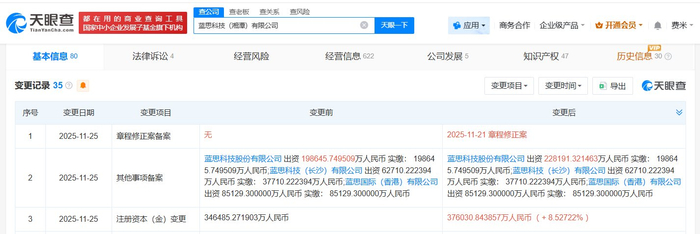 雷达财经讯,天眼查工商信息显示,近日,蓝思科技(湘潭)有限公司发生工商变更,注册资本由约34.65亿人民币增至约37.6亿人民币,增幅约9%。
