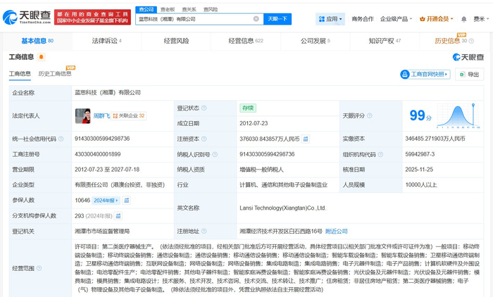 蓝思科技(湘潭)有限公司成立于2012年7月,法定代表人为周群飞,经营范围包括第二类医疗器械生产、移动终端设备制造、通信设备制造、智能车载设备制造、集成电路制造等。股东信息显示,该公司由蓝思科技(300433)、蓝思国际(香港)有限公司、蓝思科技(长沙)有限公司共同持股。值得一提的是,此前,蓝思科技(长沙)有限公司发生工商变更,注册资本由约31.03亿美元增至约34.57亿美元,增幅约11%。