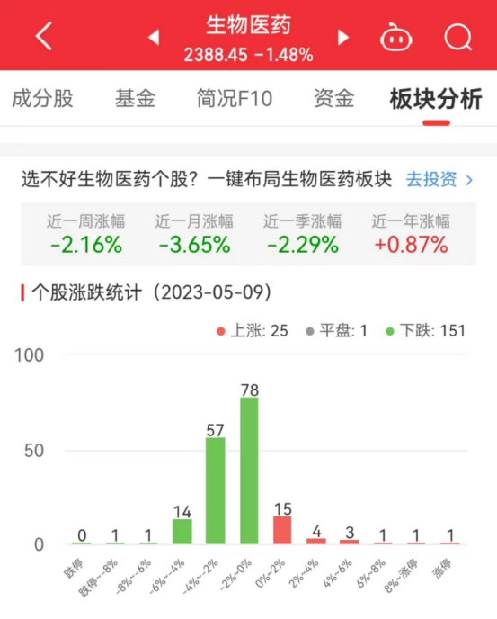 中国经济网北京5月9日讯今日,生物医药板块整体跌幅1.48%,其中25只股票上涨,1只股票平盘,151只股票下跌。