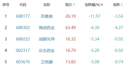 百奥泰、海创药业、成都先导、众生药业、卫信康位列涨幅榜后五位,涨幅分别为-11.97%、-6.30%、-5.34%、-5.20%、-5.08%。