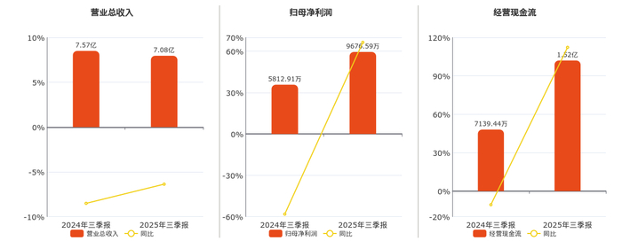 公司营业总收入为7.08亿元,较去年同报告期营业总收入减少4820.03万元,同比较去年同期下降6.37%。归母净利润为9676.59万元。经营活动现金净流入为1.52亿元。