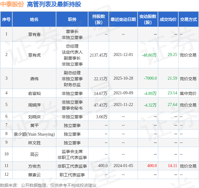 中泰股份近半年内的董监高及核心技术人员增减持详情如下: