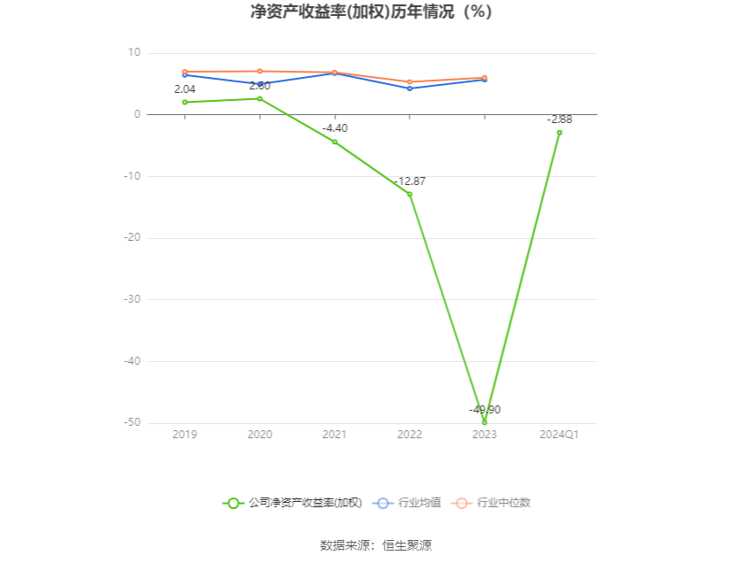 数据显示,2024年第一季度公司加权平均净资产收益率为-2.88%,较上年同期增长4.18个百分点;公司2024年第一季度投入资本回报率为-0.61%,较上年同期增长5.24个百分点。
