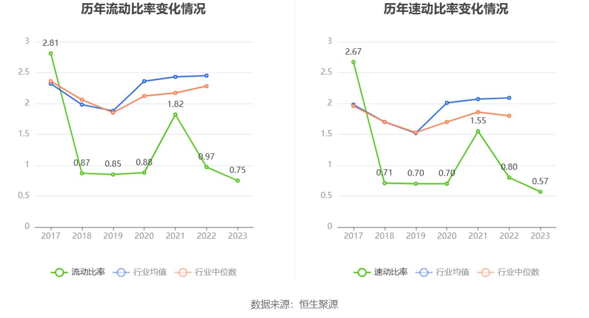 2023年,公司流动比率为0.75,速动比率为0.57。