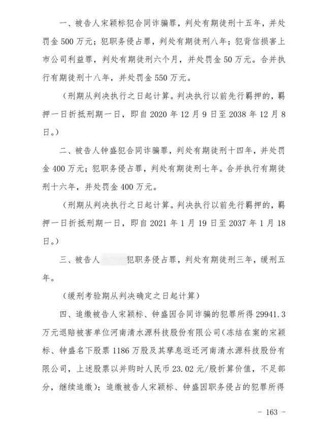 最终,济源中院一审判决宋颖标犯合同诈骗罪、职务侵占罪、背信损害上市公司利益罪,合并执行有期徒刑18年,并处罚金550万元;判决钟盛犯合同诈骗罪、职务侵占罪,合并执行有期徒刑16年,并处罚金400万元。此外,追缴宋颖标、钟盛因合同诈骗的犯罪所得2.99亿元退赔被害单位清水源,追缴其他违法所得等。