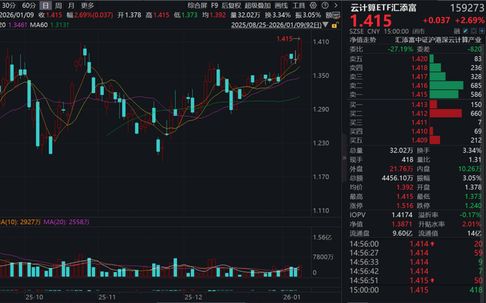 今日(1.9),沪指涨近1%站上4100点,豪取16连阳!算力板块再度强势,云计算ETF汇添富(159273)放量收涨2.69%,全天成交额超4400万元,环比放量33%。