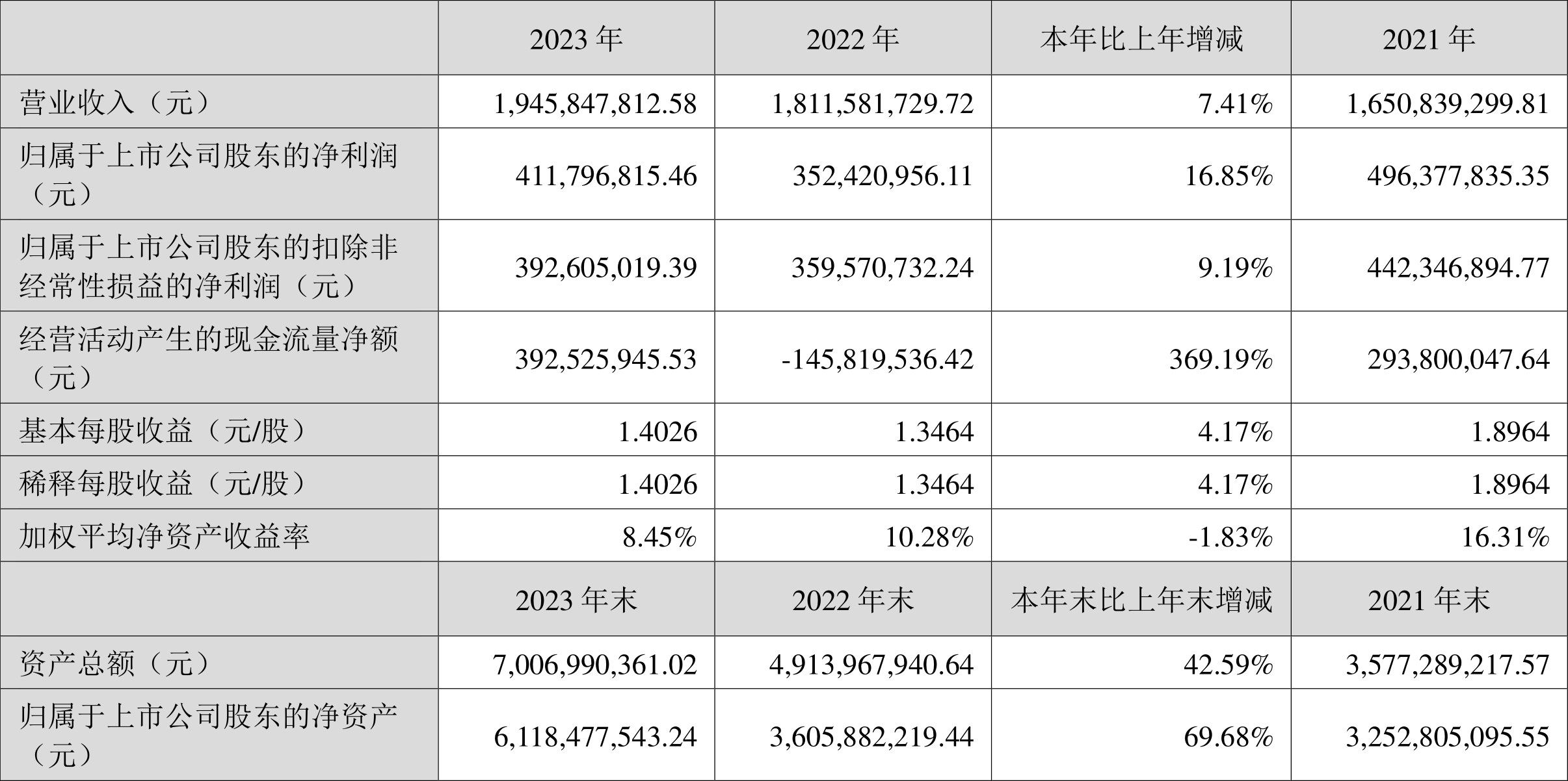 中证智能财讯 金雷股份(300443)4月24日披露2023年年报。2023年,公司实现营业总收入19.46亿元,同比增长7.41%;归母净利润4.12亿元,同比增长16.85%;扣非净利润3.93亿元,同比增长9.19%;经营活动产生的现金流量净额为3.93亿元,上年同期为-1.46亿元;报告期内,金雷股份基本每股收益为1.4026元,加权平均净资产收益率为8.45%。公司2023年年度利润分配预案为:拟向全体股东每10股派2.6元(含税)。