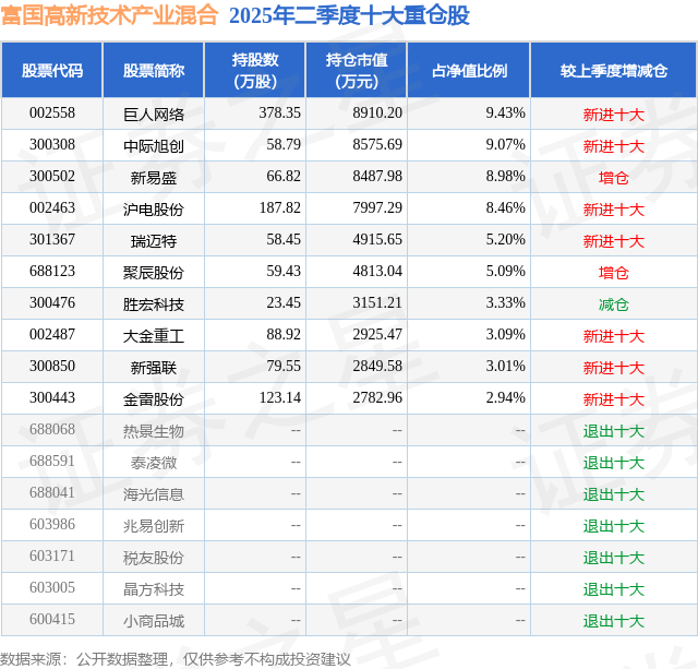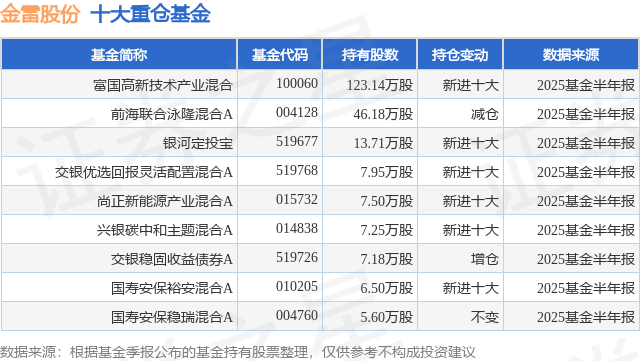 根据2025基金半年报公募基金重仓股数据,重仓该股的公募基金共9家,其中持有数量最多的公募基金为富国基金的富国高新技术产业混合。富国高新技术产业混合目前规模为9.45亿元,最新净值3.655(9月16日),较上一交易日上涨0.94%,近一年上涨85.06%。该公募基金现任基金经理为李元博。