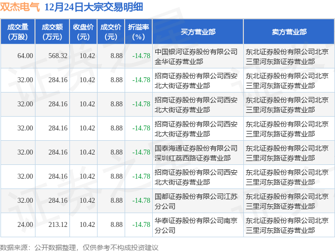 证券之星消息,12月24日双杰电气发生大宗交易,交易数据如下: