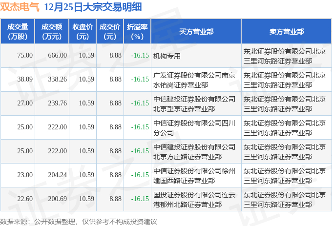 12月25日双杰电气现7笔折价16.15%的大宗交易 合计成交2092.95万元