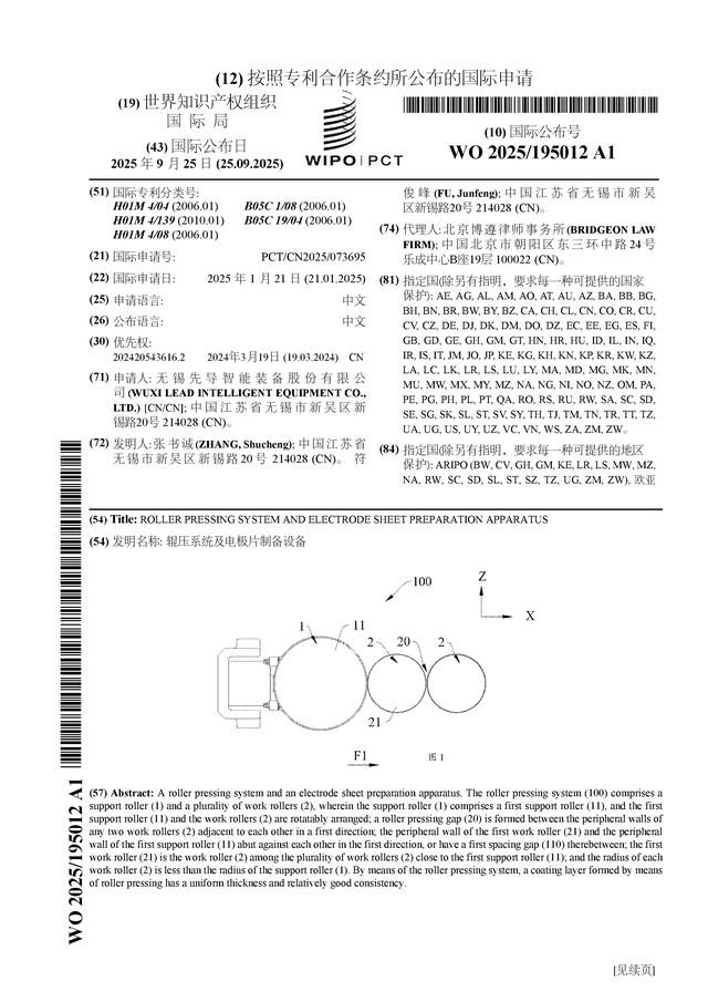 先导智能公布国际专利申请:“辊压系统及电极片制备设备”
