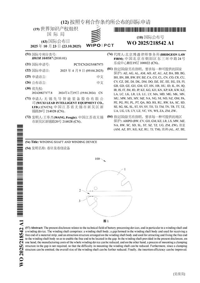 先导智能公布国际专利申请:“卷针及卷绕设备”