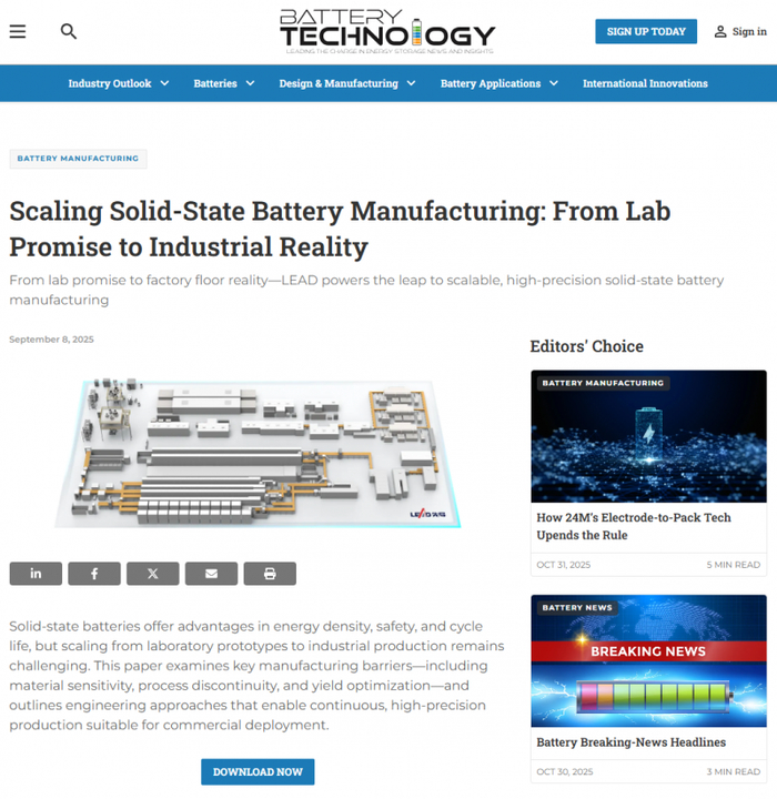 随着新能源产业对高性能储能技术的需求升级,固态电池作为下一代电池技术的核心方向,其规模化量产已成为全球能源领域的焦点议题。近日,国际电池技术权威媒体Battery Technology正式发布《固态电池制造规模化:从实验室前景到产业现实》白皮书,该白皮书由先导智能参与编撰,系统阐述了固态电池生产制造中的材料敏感性、良率控制及工艺复杂度等关键问题,直指固态电池从实验室走向规模化制造的核心痛点,并首次系统性提出了以超高精度锂箔轧制、电解质膜精密制造、界面在线改性为核心的端到端解决方案,为行业提供了从实验室原型到吉瓦级量产的可行性路线图。