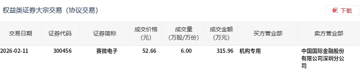 2月11日,赛微电子大宗交易成交6万股,成交额315.96万元,占当日总成交额的0.14%,成交价52.66元,较市场收盘价52.66元持平。